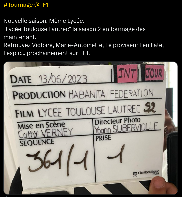 Sur Twitter, TF1 vient d’annoncer le lancement du tournage de la saison 2 de sa série Lycée Toulouse-Lautrec.